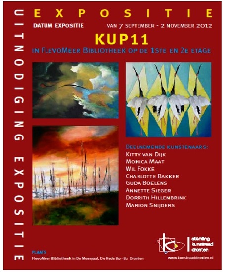 KUP 11 [ Kunst uit de Polder] een groep beeldende kunstenaars nodigt u van harte uit de expositie in de bibliotheek van Dronten in theater de Meerpaal te bekijken. De Stichting Kunstraad Dronten heeft in samenwerking met de FlevoMeer Bibliotheek een kleurrijke expositie van ons werk ingericht op de eerste en tweede etage. [De Rede 80-82 Dronten] Met vriendelijke groeten, Monica Maat,