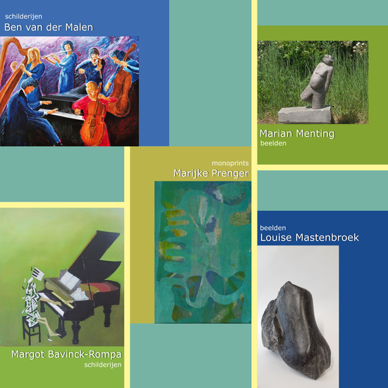 Bij toeval samengekomen en van alles gedaan op kunstgebied. En toevallig nu ook een gezamenlijke expositie: Ben van der Malen, Margot Bavinck-Rompa - schilderijen, Marijke Prenger - monoprints, Louise Mastenbroek en Marian Menting - beelden