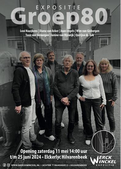 Expositie van GROEP 80 in Cultureel Centrum Elckerlyc in Hilvarenbeek. Opening is op zaterdag 11 mei 2024 om 14.00 met muzikale omlijsting. Er zijn tekeningen, schilderijen, collages, objecten van hout, keramiek en textiel te zien van Toon van Gisbergen, Quirijne de Kok, Janine van Rijswijk, Wim van Gisbergen, Diana van Acker, Looi Naaijkens en Joan Engels.