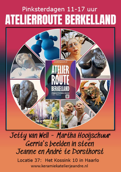 Atelierroute Berkelland. Op onze locatie aan Het Kossink 10 zal in de werkelijk práchtige tuin een mengeling te zien zijn aan keramiek (Jeanne en André te Dorsthorst, Martha Hooijschuur), schilderijen (Jetty van Well) en natuurstenen beelden (Ria en Gerda). Begeleid door de zang van vogels en onze troubadour Ton Kolkman. Het wordt vast en zeker weer heel gezellig! Routeboekjes verkrijgbaar.