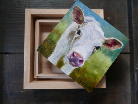 Nu te koop bij Art Zaanstad, kleine werkjes van 10 x 10 cm van Kalfjes, lijkt schilderijtje maar is ook een doosje waarin je iets '''dierbaars" kan bewaren. info@artzaanstad.nl