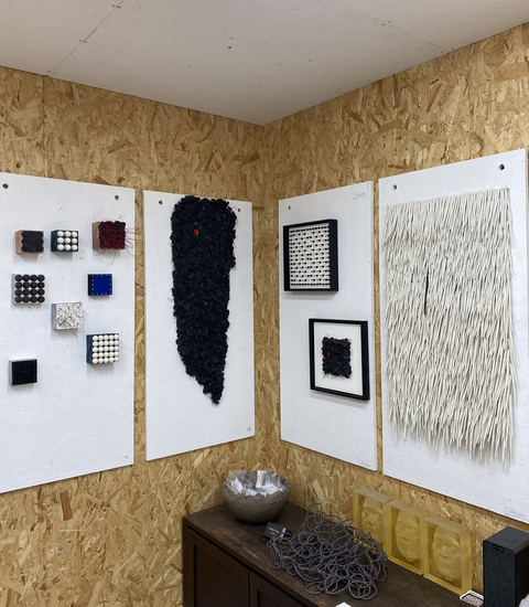 Eigen werk. Keramiek, textiel, staal.