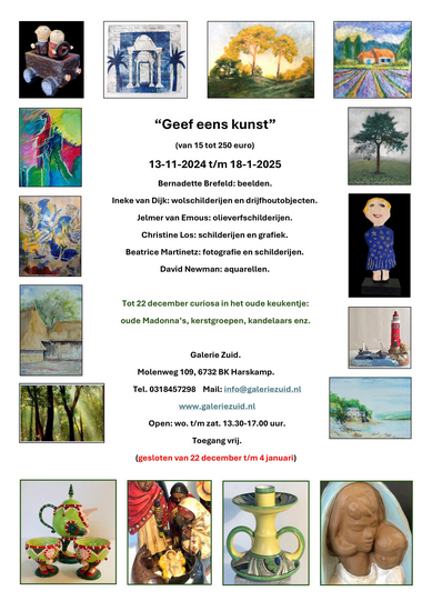 Groepsexpositie in Galerie Zuid in Harskamp. Van €15,-- tot €250,-- Bernadette Brefeld: beelden, Ineke van Dijk: wolschilderijen en drijfhoutobjecten, Jelmer van Emous: olieverfschilderijen, Christine Los: schilderijen en grafiek, Beatrice Martinetz: fotografie en schilderijen, en ik, David Newman, met mijn aquarellen! De galerie is gesloten van 22 december t/m 4 januari
