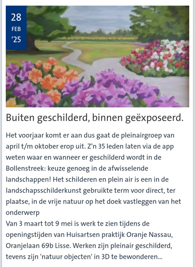 Te zien van diverse kunstenaars schilderijen en ruimtelijke werken pleinair geschildersd of gemaakt met of nav de natuur. Er hangen 6 schilderijen van mij.