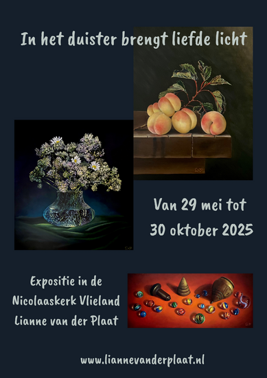 Expositie in de kerk op Vlieland. Lianne van der Plaat, realistisch schilder, gespecialiseerd in het schilderen van stillevens, exposeert op Vlieland. In haar werk zoekt Lianne naar de essentie van verbinding, verwondering en eenvoud. Zij legt liefde in haar werk en wil met haar werk die liefde doorgeven. Want liefde brengt licht, rust en vrede. De wereld kan het gebruiken. Opening: 29-5-25