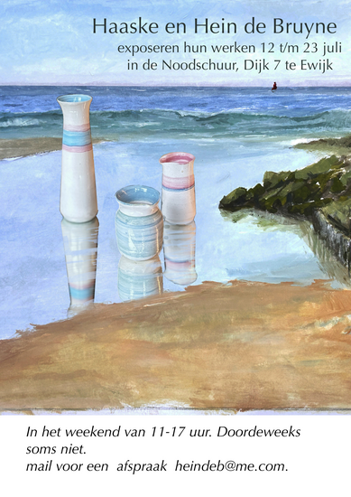 Zee, golven, wind en water en ook nog klei In de Noodschuur te Ewijk tonen Hein ( schilderijen) en Haaske (keramiste) divers werk , vaak met het thema strand en zee