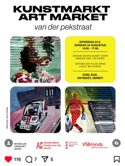 Kunstmarkt Artmarket. Kunst tot €150 Pexpo van der Pekstraat 46 Amsterdam Noord. Ramon jan Vet is deelnemer aan deze kunstmarkt. 24 augustus aanwezig. Komt allen! Ja, gezellig!