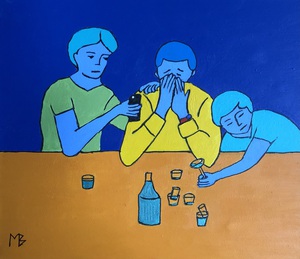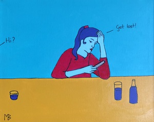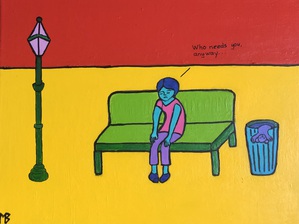 Expositie van Marleen Beuvink (Cartoon art) en Ilse Scholten (Keramiek) Cartoon art schilderijen met als thema de menselijke emotie; eenzaamheid, vreugde, verdriet, teleurstelling uitgevoerd in simpele vormen en felle kleuren die contrasteren met de onderwerpen die geschilderd zijn.