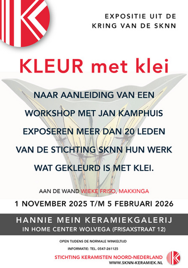 Op de eerste verdieping van Home Center is het werk van keramisten uit de kring van de Stichting Keramisten Noord Nederland te vinden. Ieder kwartaal wordt een nieuwe expositie ingericht waarbij diverse keramisten hun werk tonen. Deze keer zijn ca. 100 werken te zien die gekleurd zijn met engobe of terra sigilata.