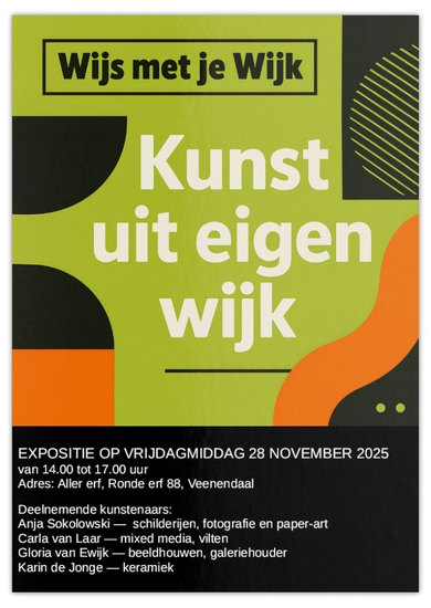 Op vrijdagmiddag 28 november presenteren, in de grote zaal van het Aller Erf, 4 Kunstenaars uit onze Wijk met trots hun werk en ze nodigen u van harte uit om te komen kijken, voelen, beleven en in gesprek te gaan. Gloria van Ewijk, Beeldhouwer & galeriehouder, Carla van Laar – Mixed Media & Vilten, Karin de Jonge – Keramiek, Anja Sokolowski – Schilderen, Fotografie & Paper-art