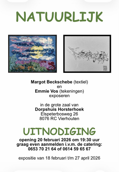 "Natuurlijk" expositie van Margot (textiel) en Emmie (Tekeningen)