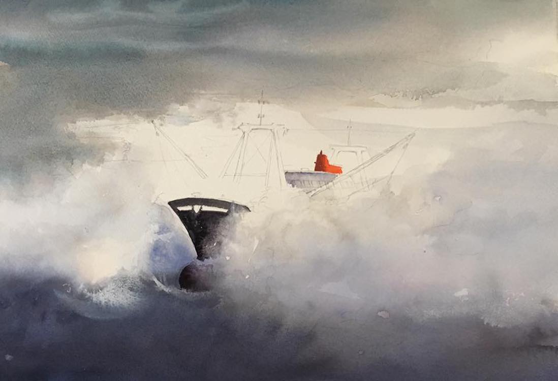 In onderstaande fotoserie is de totstandkoming van van de aquarel 'Fishing in rough sea' te zien.
