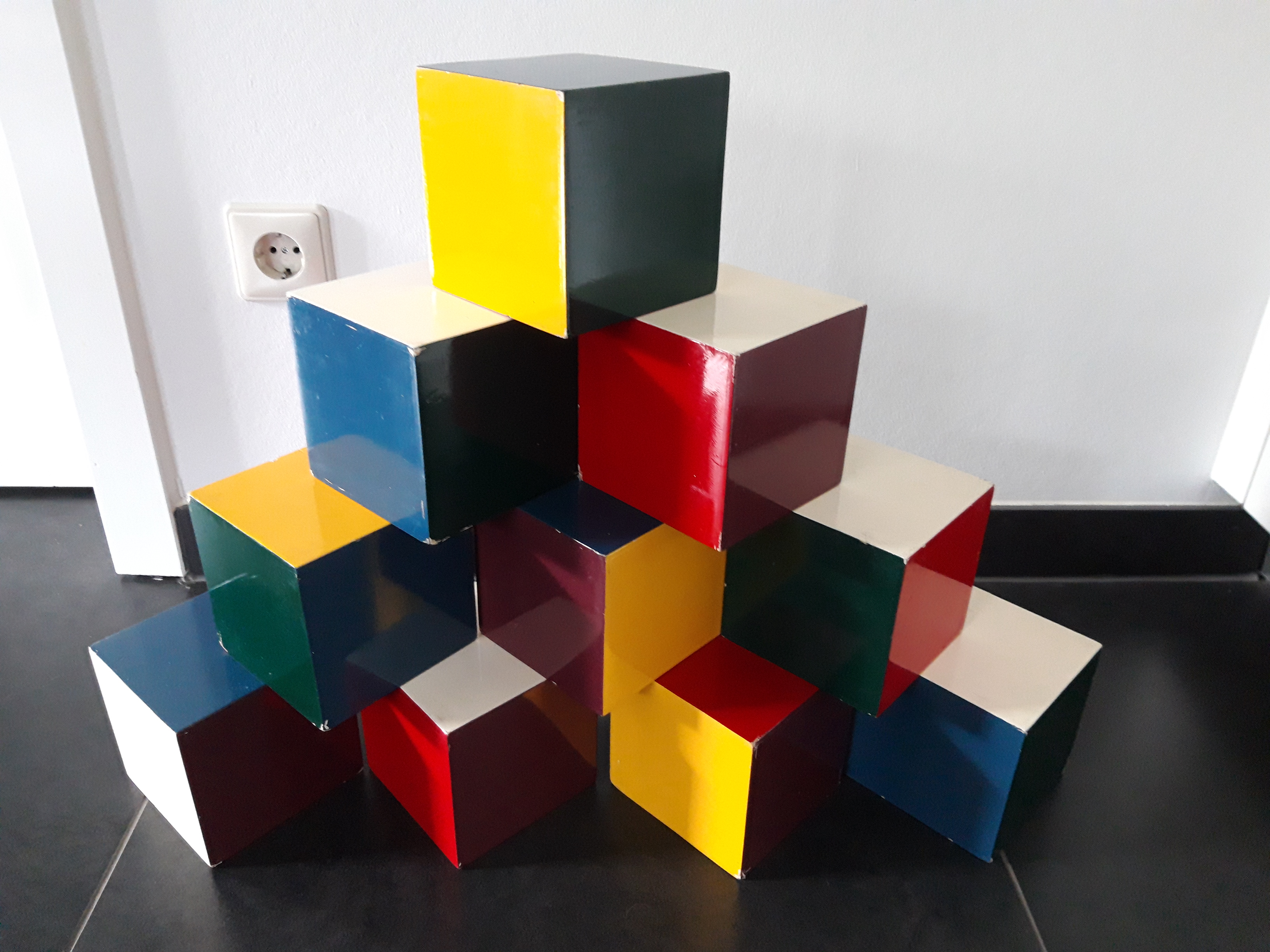 Als verzamelaar van oud speelgoed heb ik recentelijk 10 houten kubussen gekocht die te mooi lijken om speelgoed te zijn. De kubussen zijn 12x12x12, met elk de zelfde 6 verschillende kleuren. Ze zijn perfect gezaagd, gelijmd en gelakt/gespoten.