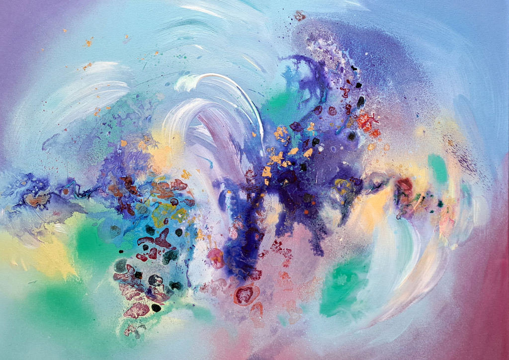 Mijn abstracte, expressieve schilderijen vormen een twee-eenheid met steeds een bijzondere edelsteen. Kleur, vorm en energie worden intuïtief door mij vertaald en expressief op het doek gezet.