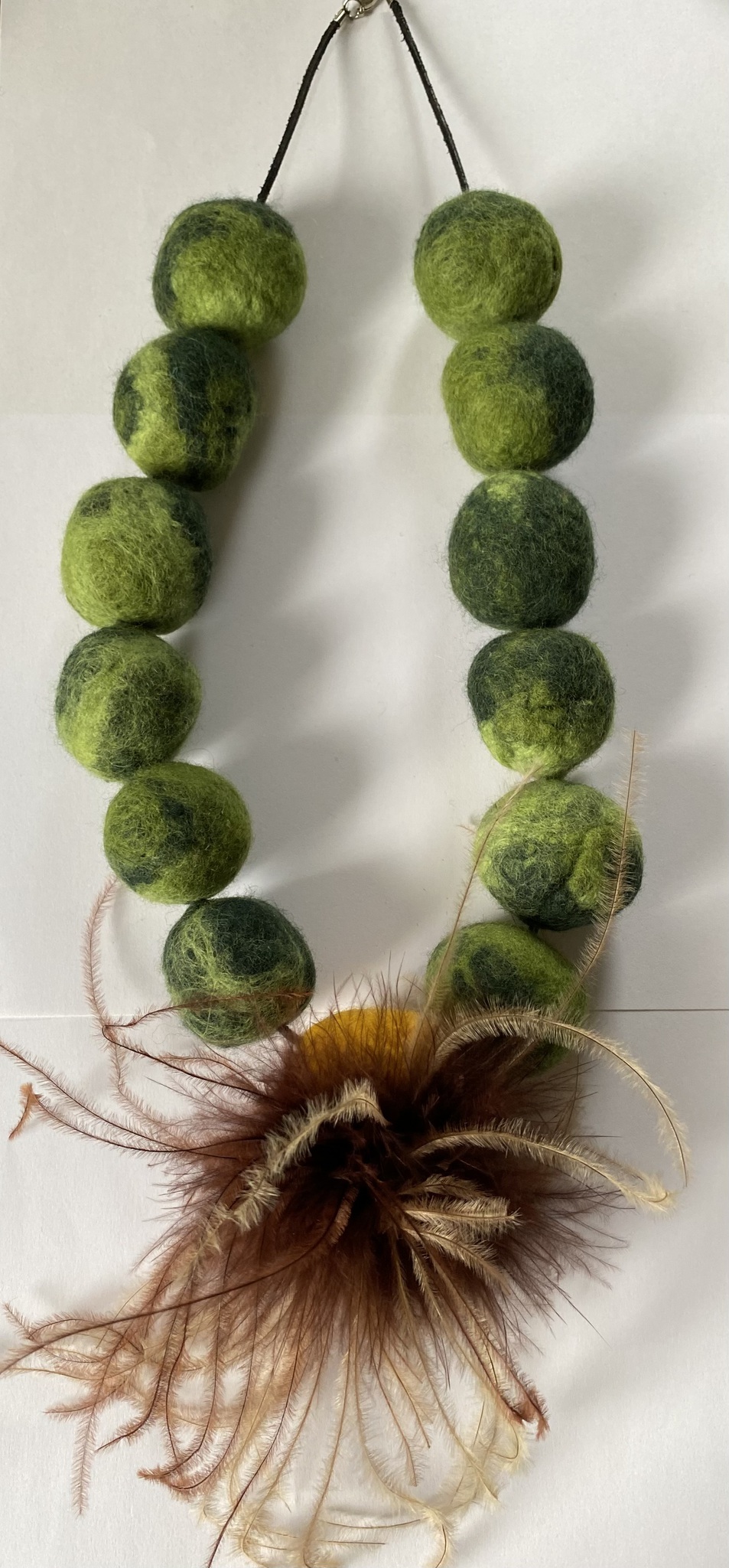 Deze ketting is licht van gewicht. Er hangen veertjes aan van een vogel. Welke weet ik niet.