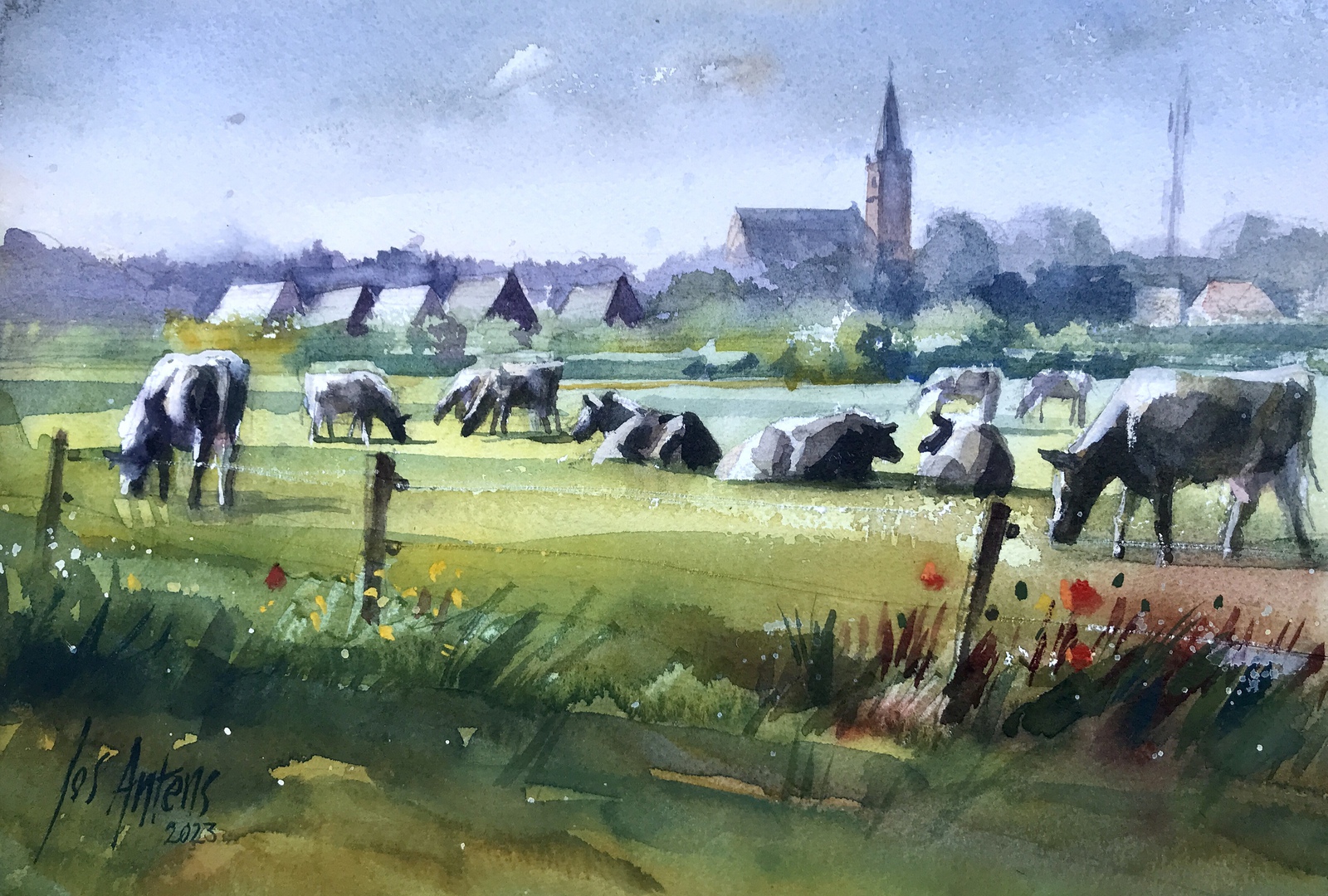 zicht op Nispen in aquarel