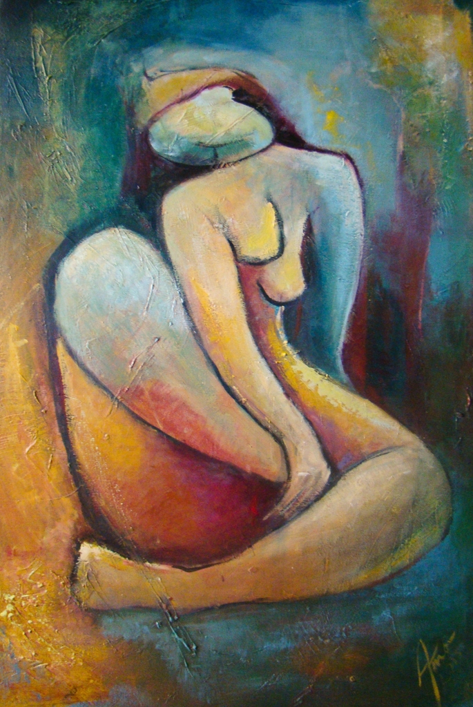 Acryl Doek Vrouw Figuratie Kleur Rood Geel Groen Blauw Fauvisme Expressionisme Poëtisch Introvert