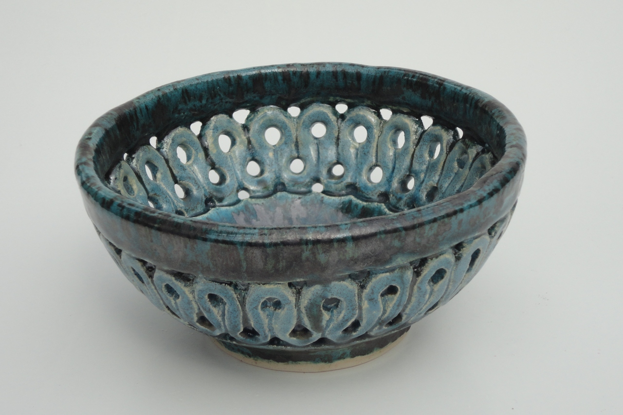 opengewerkte schaal met grieks patronen in kleuren groen/blauw