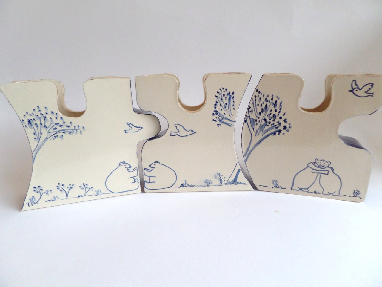 3-delige set puzzelstukken met blauwe engobe decoratie met goudluster bovenzijde open, prijs is per stuk