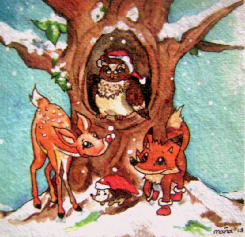 Kerstkaart Vos Uil Hert Egel Sneeuw