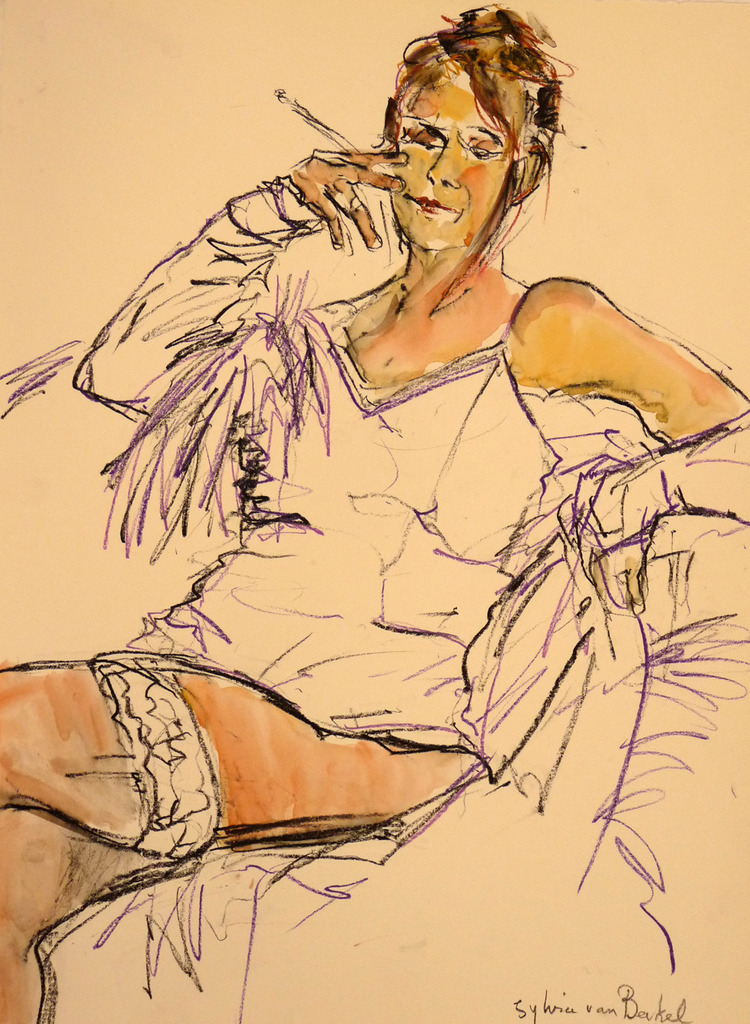 zittende vrouw met lange handschoenen en sigarettenpijpje