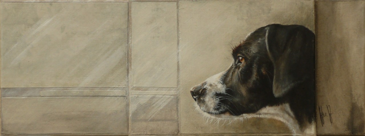 Sloeber aan het raam, kruising beagle-border collie