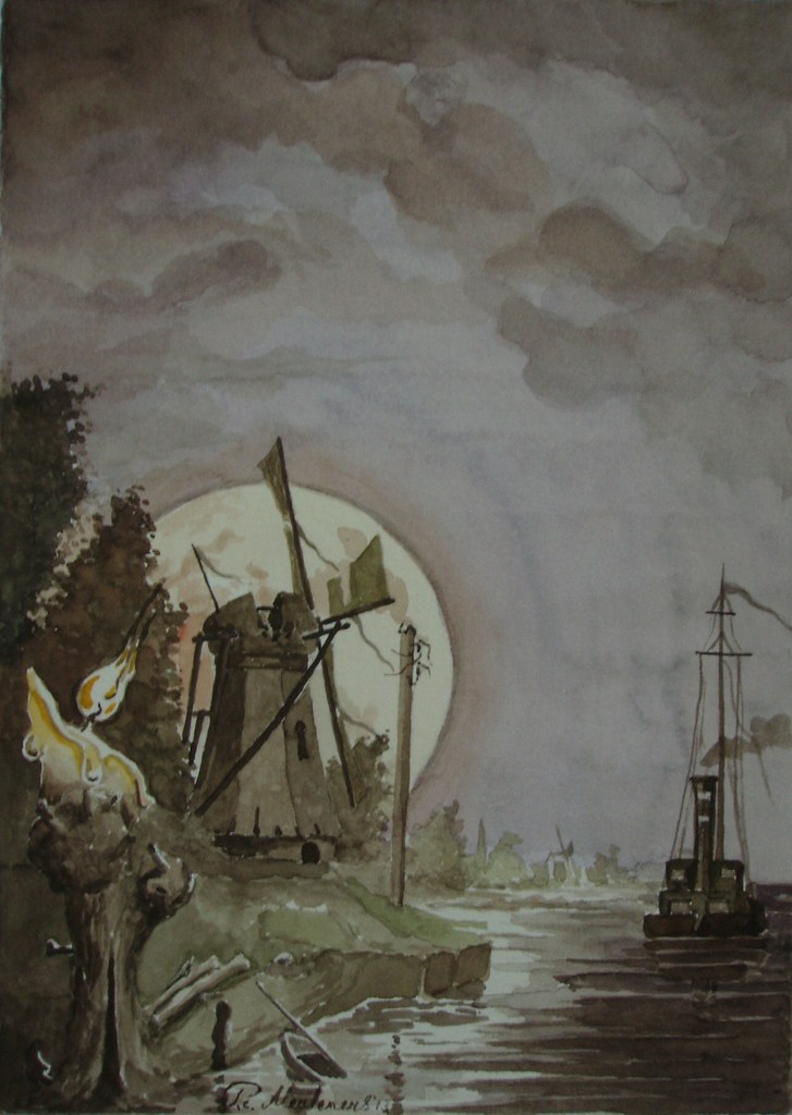 Zee Boot Molen Kaars Water Papier Aquarel Nacht Maanlicht Romantiek Realisme Fantasie