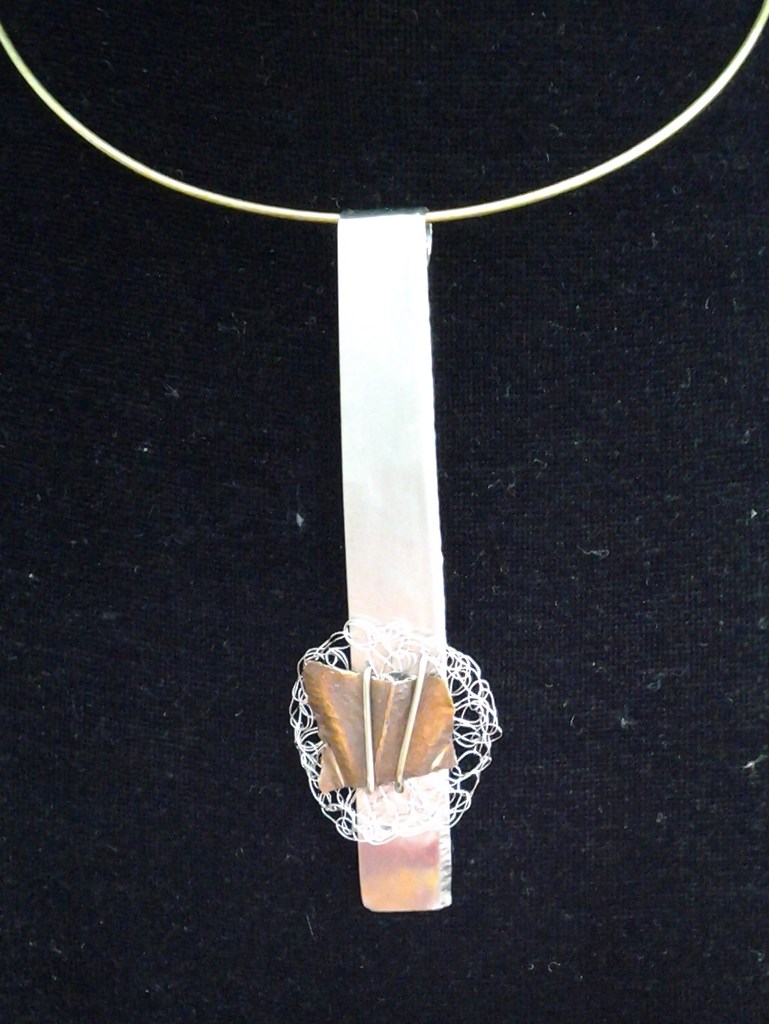 Hanger van bewerkt RVS plaatje met erop gemonteerd met RVS draad een bewerkt plaatje messing met eronder een fijn haakwerkje van RVS draad.
