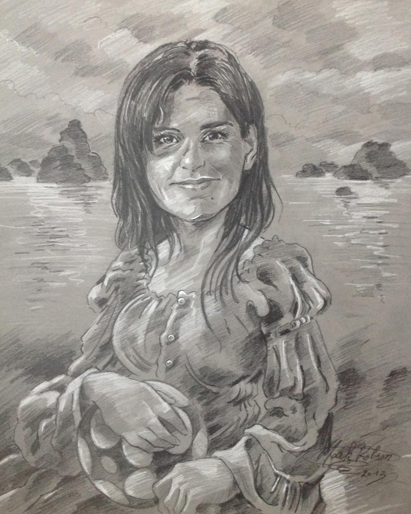 Verrassingsportretje van en voor een lieve collega. Hierbij werd het tijdloze en mysterieuze van de Mona Lisa van Leonardo Da Vinci gebruikt om een meer hedendaagse versie te maken met unieke schoonheid uit het heden. Persoonlijke symboliek: het exotische zeelandschap in de achtergrond, gecombineerd met de korfbal in de voorgrond. Pastelpotlood op Cansonpapier