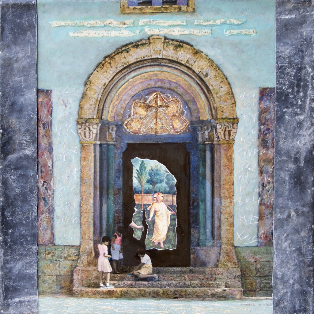 Olieverf schilderij. Lieve vrienden, een paasgroet, om jullie toe te wensen, dat er kracht en hoop zal zijn door de nabijheid in alles van Hem die voor ons stierf en opstond.