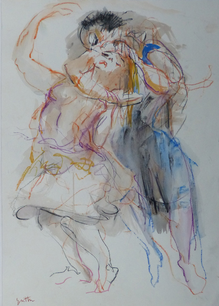Een dans waarbij improvisatie een grote rol speelt Aquarelkrijt en aquarel