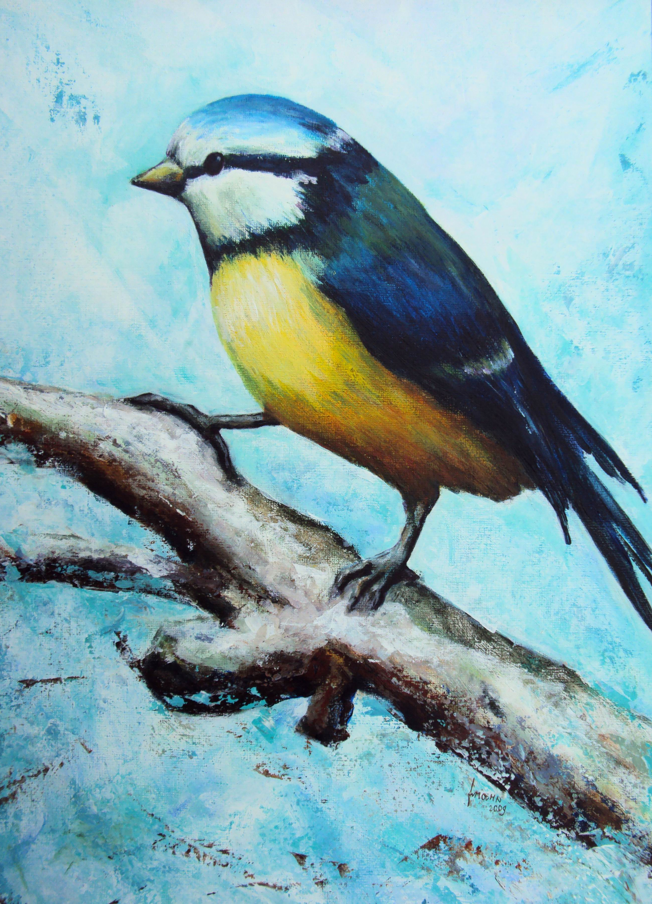 Pimpelmees in de sneeuw. Dit schilderij wordt ingelijst in een natuurhouten whitewas lijst, achter glas, verkocht.