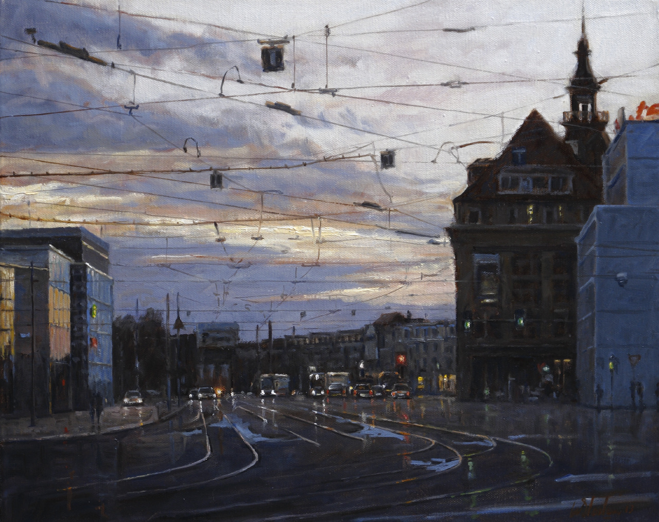 Plein Avondschemering Tramrails Bovenleiding Leipzig Willy-brandt-platz