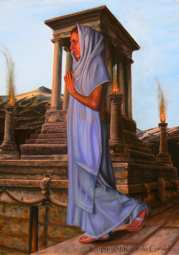 Painting Oil Figurative Fantasy Symbolism Mythology Greece Woman Draped Hood Temple Sacred Torches Fire Sky Blue Sunset Ricardo Giraldez