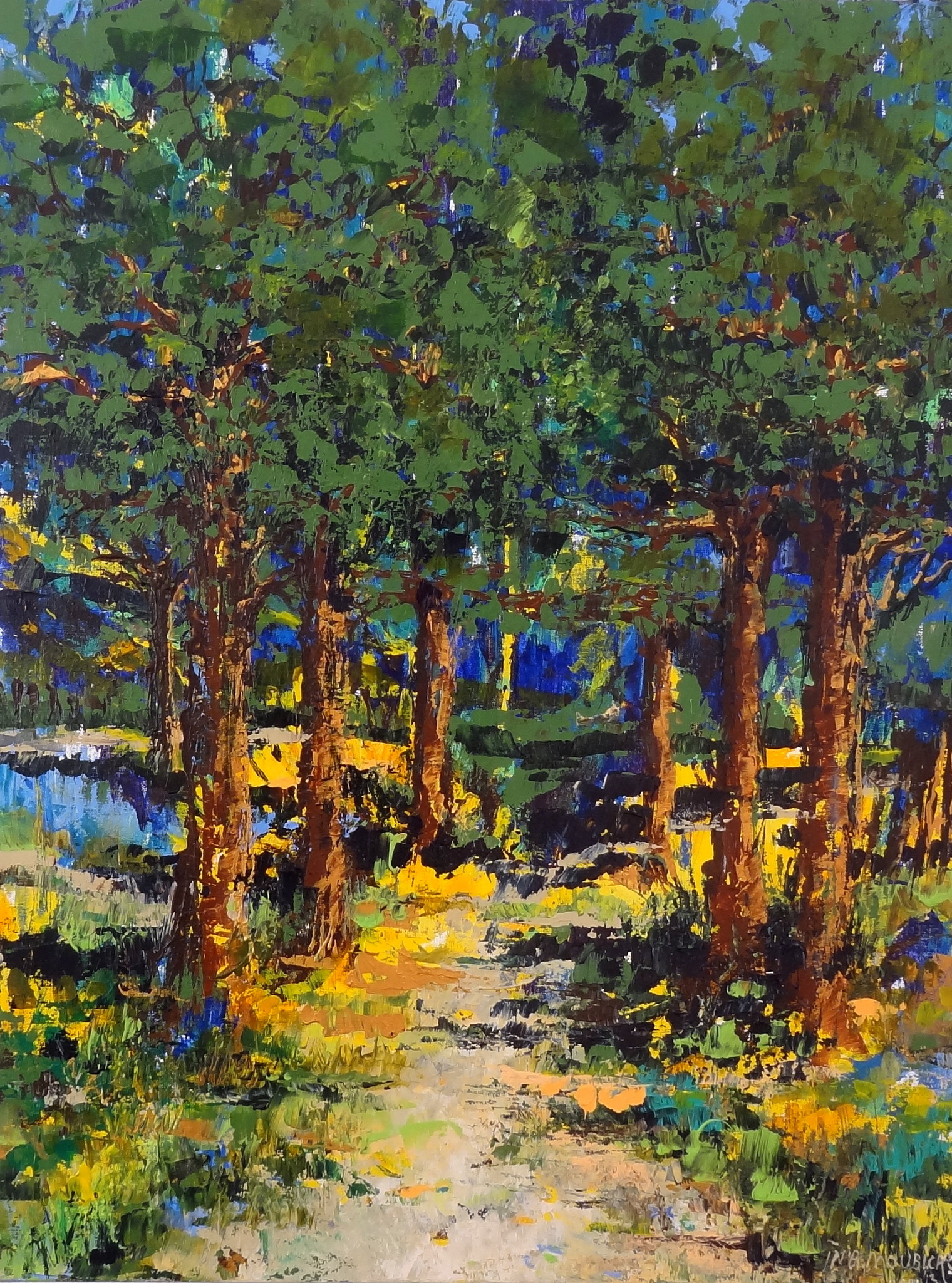 Een smal paadje vind zijn weg tussen grote groene bomen. De zonnestralen schijnen tussen de boomstammen op het zand pad. Mijn inspiratie: een natuurgebied met bossen en vennen, dicht bij mijn woonplaats, waar gewandeld en gefietst kan worden. Het bos ziet er elke dag anders uit: in de zomer, herfst, winter, rain of wanneer de zon schijnt. Het schilderij is voorzien van een houten baklijst in de kleuren zilver en zwart.
