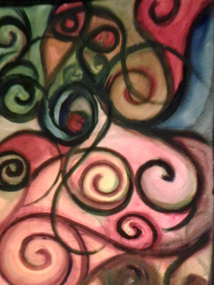 Voor het eerst met aquarelverf in de weer, wat eenpracht kleuren kun je maken, ik ben tijdens het maken hiervan in een zeer vrolijke bui en een beetje chaotisch en druk erbij. w(at ik overigens altijd wel ben) Ik denk dat deze vormen en kleuren dat zo wel het meest benaderen hoe ik op dat moment ben.