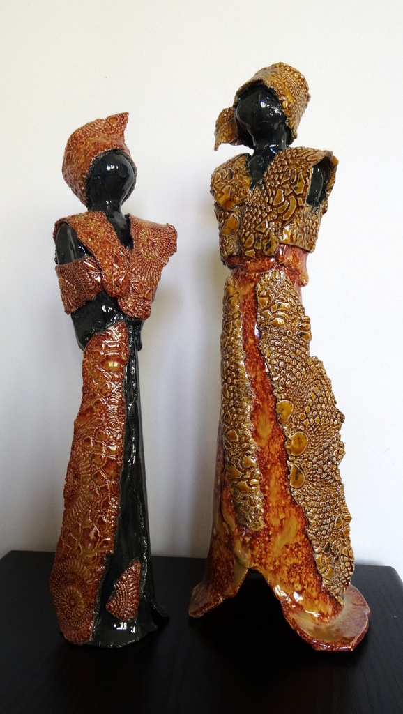 2 Vrouwen, samen, bij elkaar horend. De glazuur van het gelaat en het bovenlichaam is van zwart luster, de kanten kleding van de ene vrouw is bruin-spikkel, net als de rok van de andere vrouw; de kanten kleding daarvan is amber.