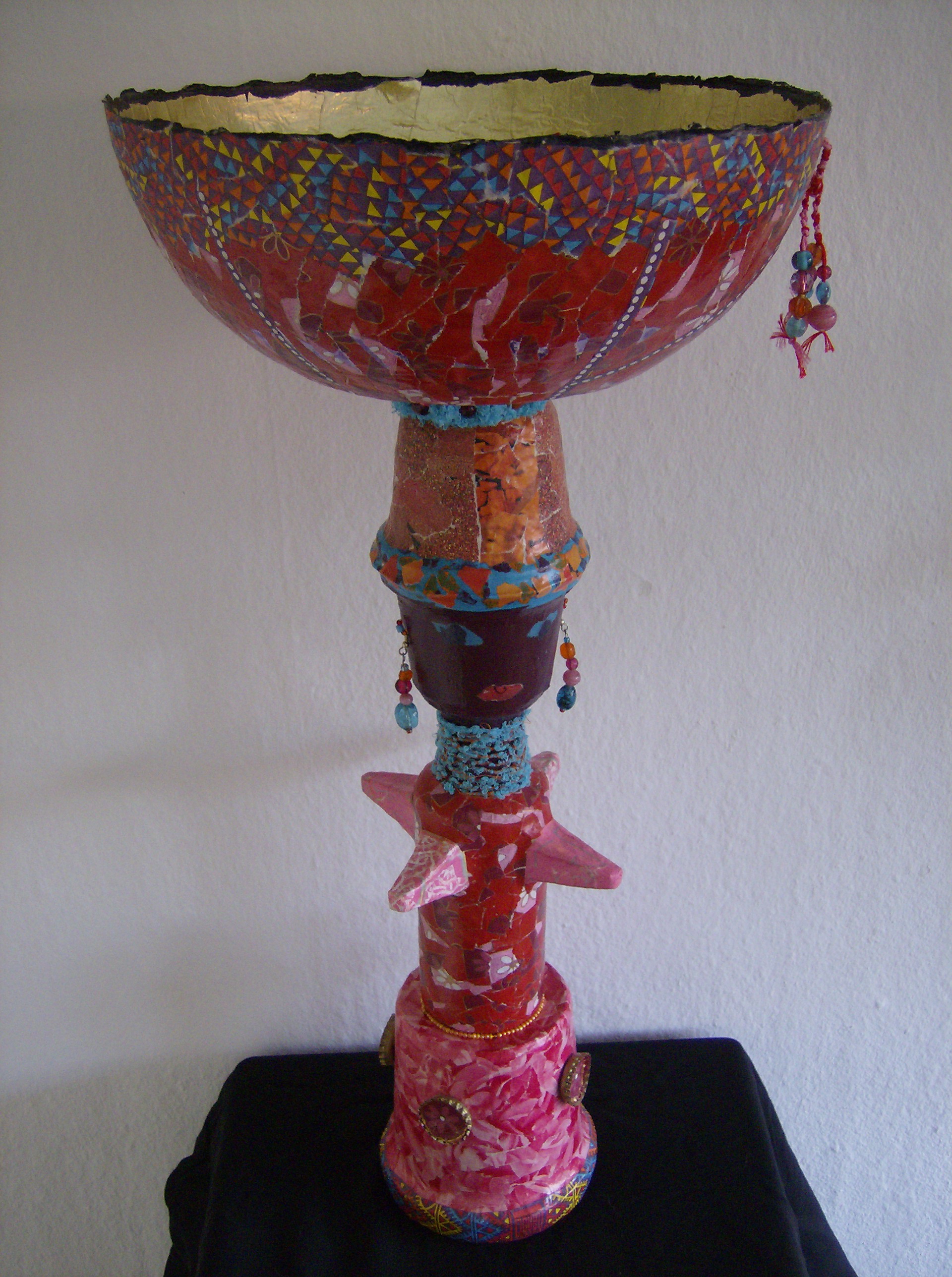 Papier maché vrouwenfiguur uit de serie Gerecyclede Godinnen opgebouwd uit afvalvormen.