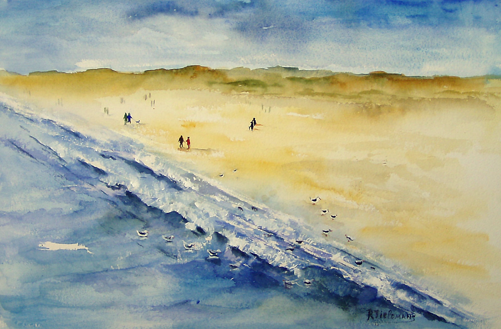 Zee Strand Figuratief Mensen Geel Blauw Yellow Groen Blue Water Papier Aquarel Realistisch Natuur Green Beach Seascape Paper Figurative Zand Zeegezicht People Sea Nature Sand