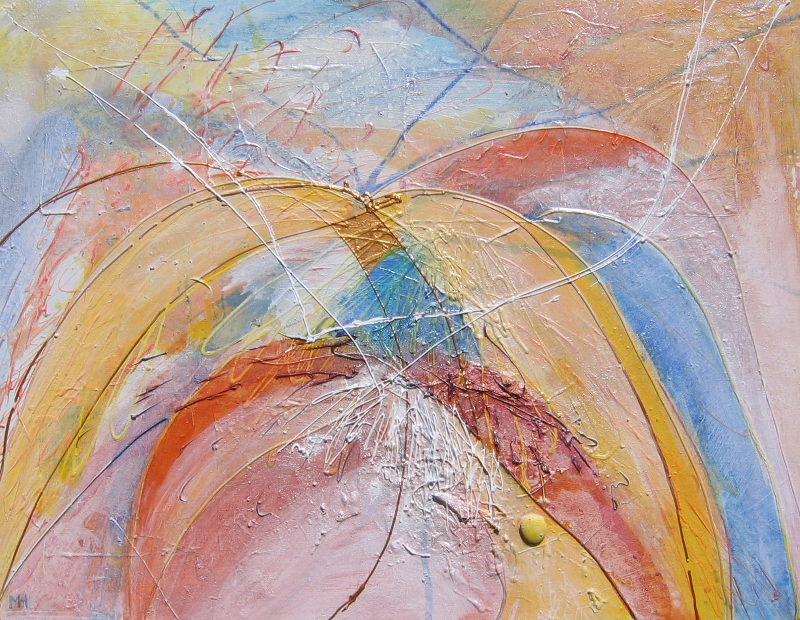 Een speels, intuïtief werk, waarin de kleuren een belangrijke rol spelen.Een vlinderachtige uitstraling.