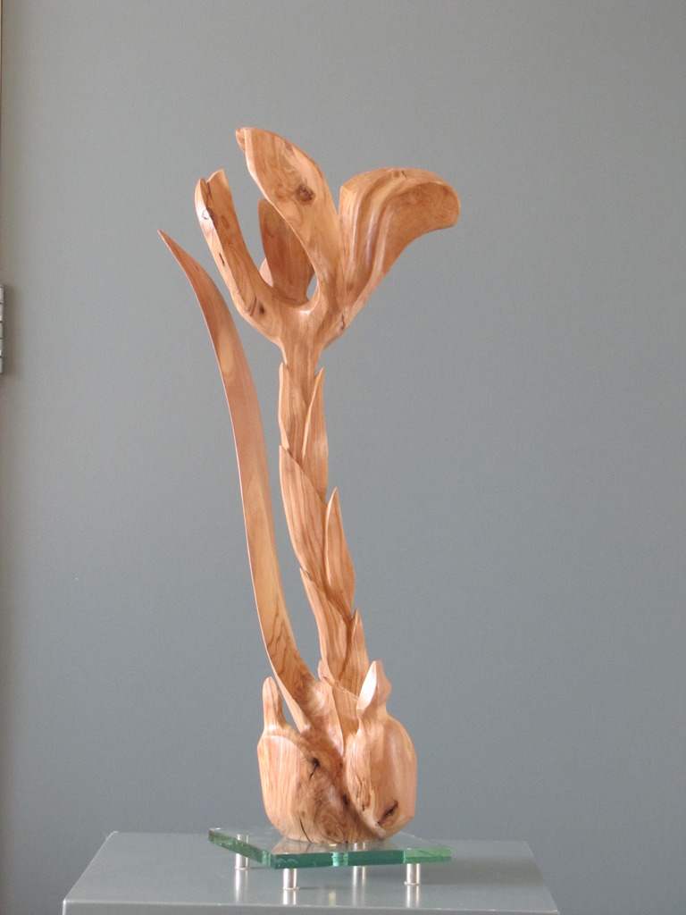 een vriend heeft zijn levenlang lelies gekweekt. voor hem dit beeld van olijfhout. De opbouw met de bollen was essentieel om goede verhoudingen in het beeld te krijgen. De losse structuur van het hout vergde diverse aanpassingen.