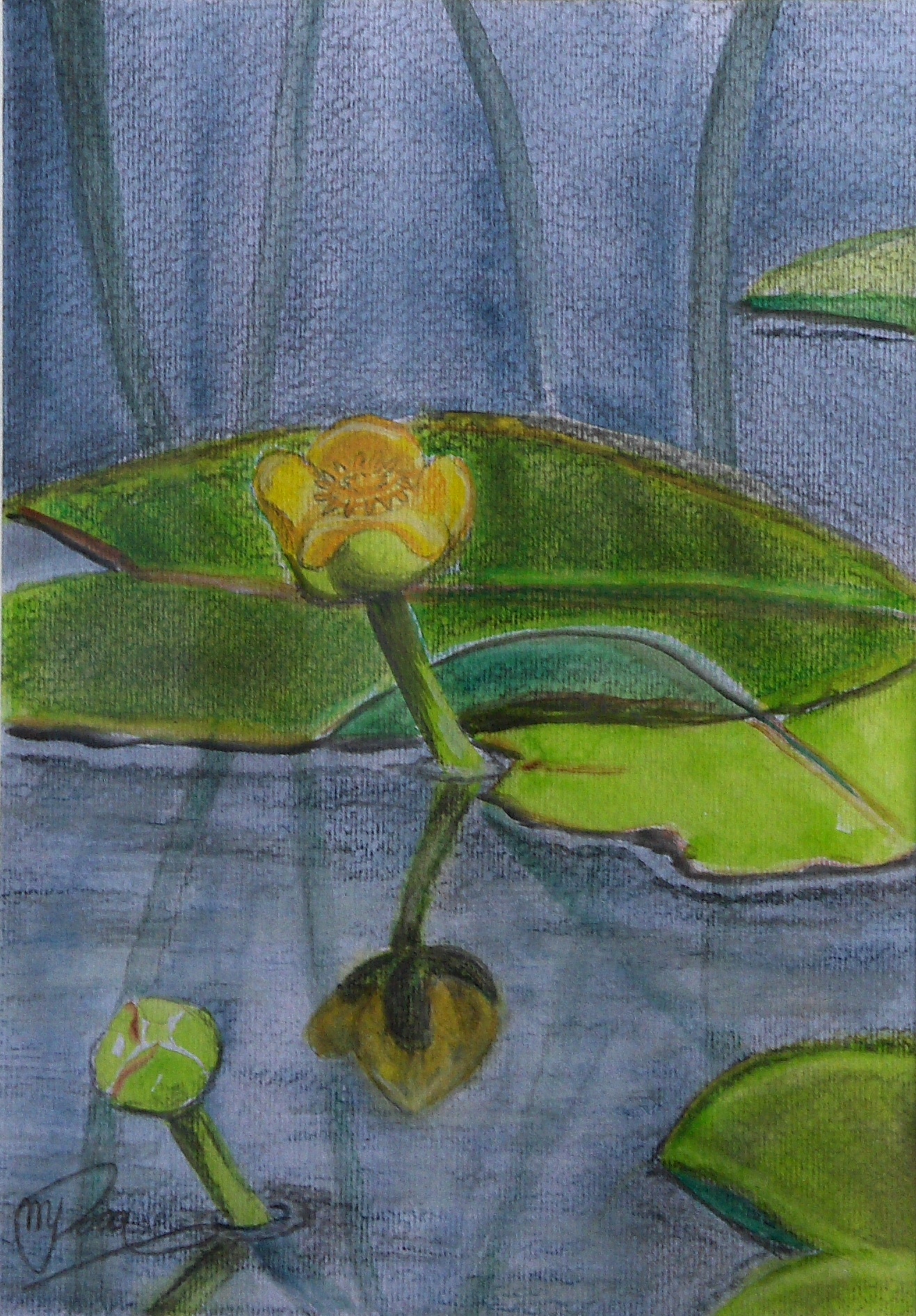 Waterlelie in aquarel, uitgewerkt met potlood.