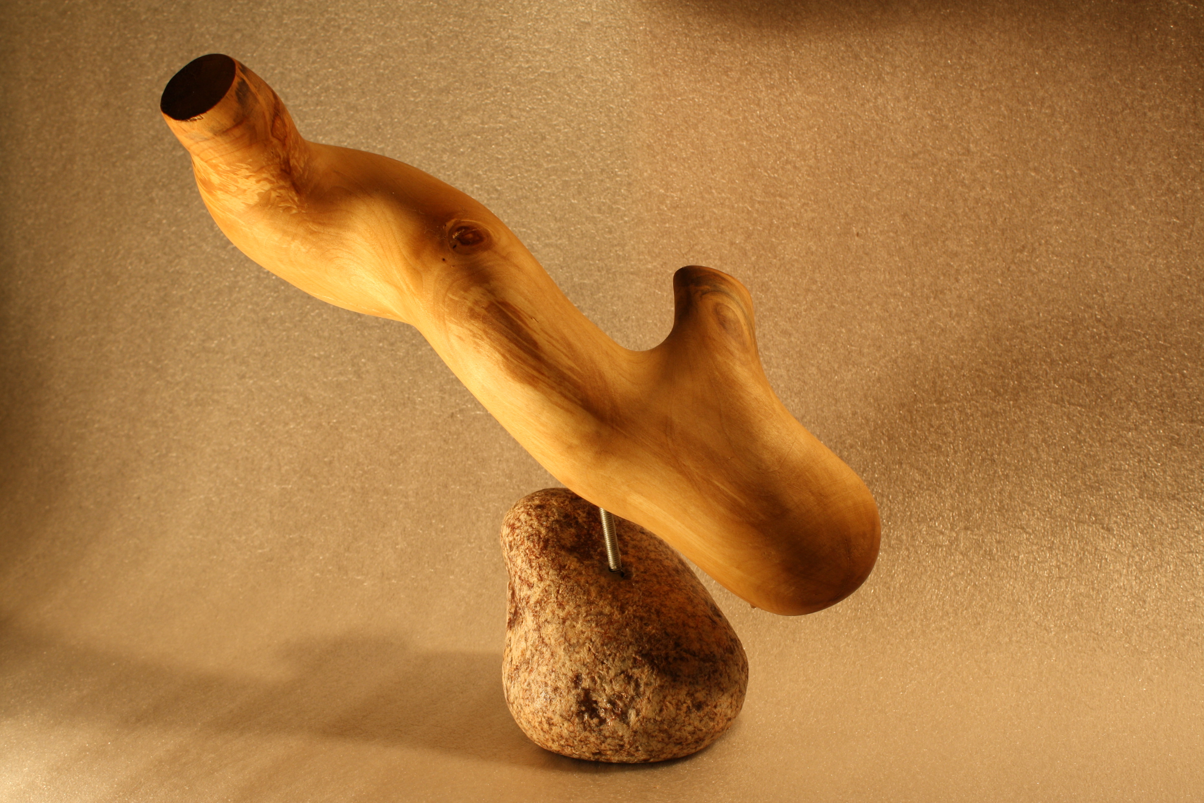 De top van een kersenboom geeft mooie takken in alle vormen. Deze tak heb ik van verschillende kanten bewerkt zodat de draaing die erin zat sterker is geworden. Op de sokkel laat ik hem zweven.