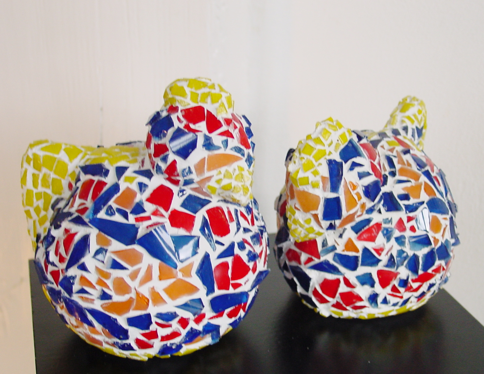 Twee keramieke kippen. De een dikker dan de ander. Hun mozaiek wijst de inwoners van Renkum de weg. Wordt tevens in het groot uitgevoerd. De maten van de grootste kip: 13,5cm diep, 13cm breed en 15cm hoog De maten van de kleinere: 13cm diep, 11cm breed en 12cm hoog Prijs op aanvraag.