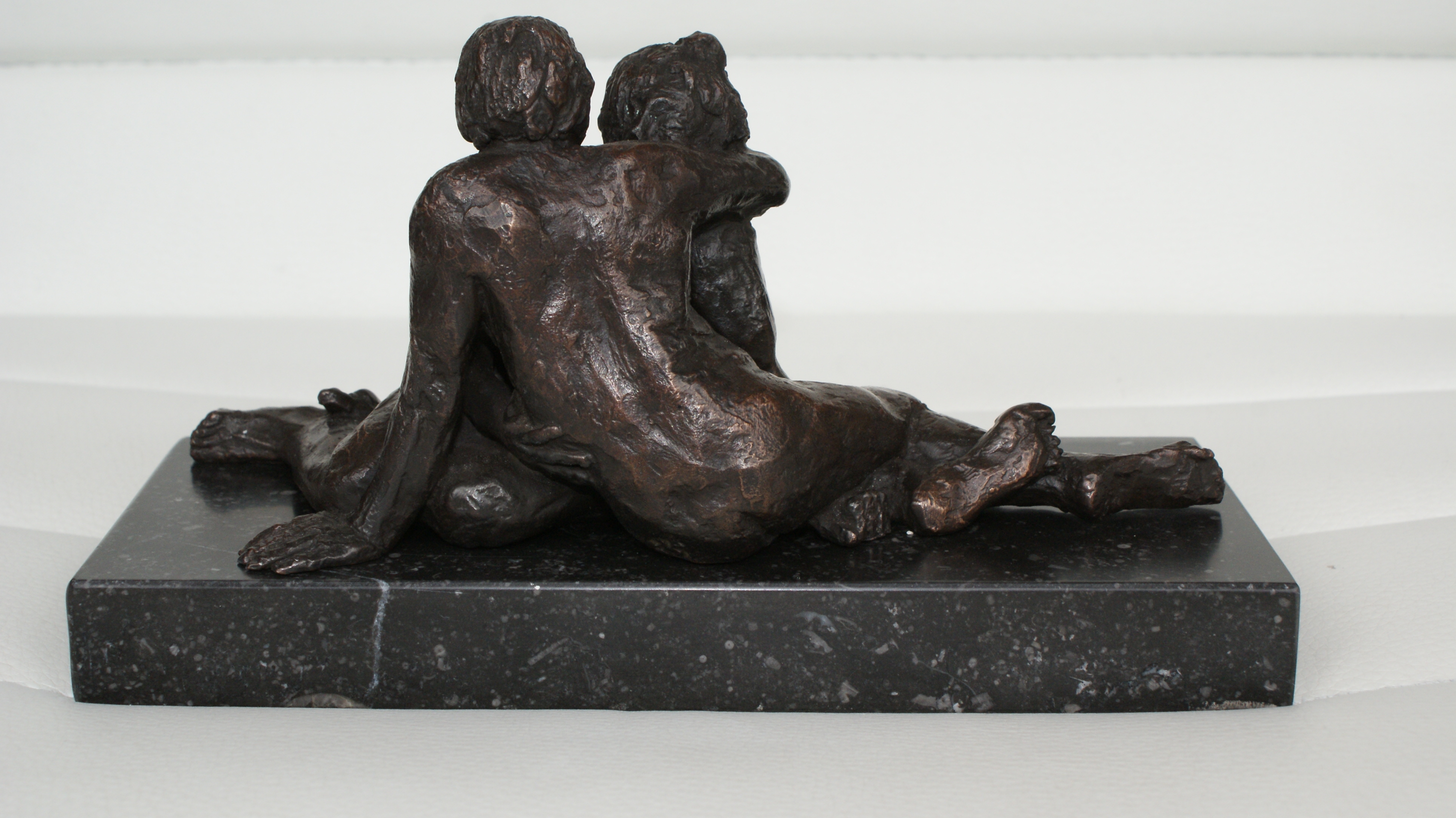 Een bronzen beeldje dat de afbeelding weergeeft van een lang durende liefde. Een vrouw liggend in de armen van een man die haar steunt, al vele jaren lang. Bijna versmolten met elkaar.