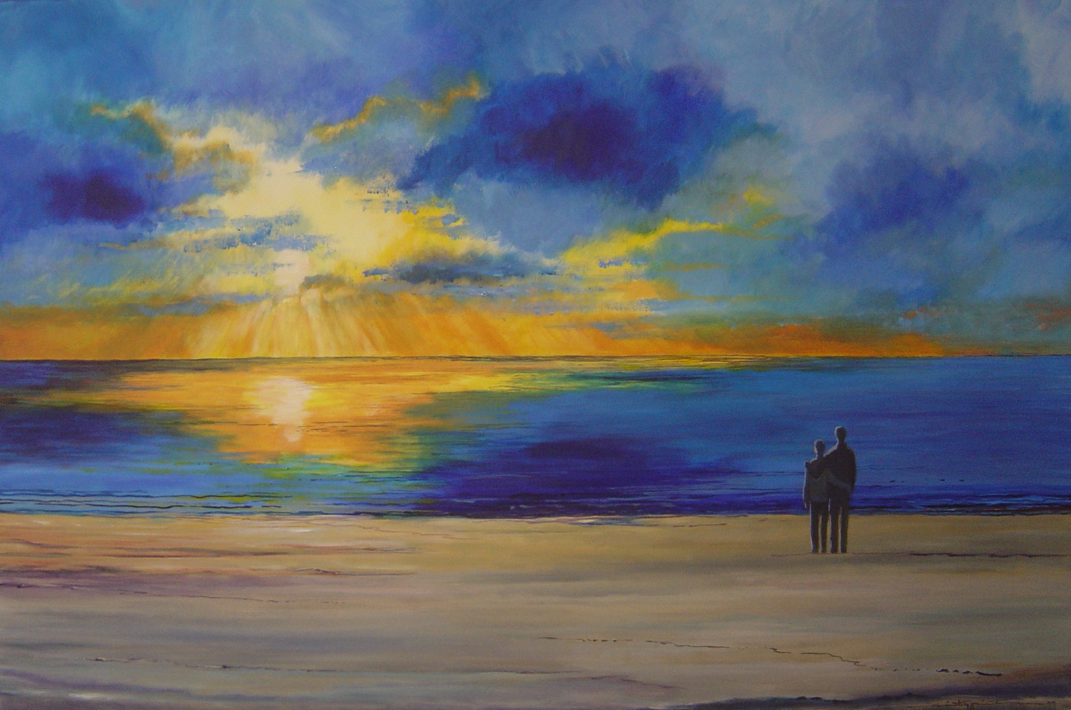 Zonsondergang aan zee. Twee verliefde mensen genieten ervan. En dáár kan ik weer van genieten.