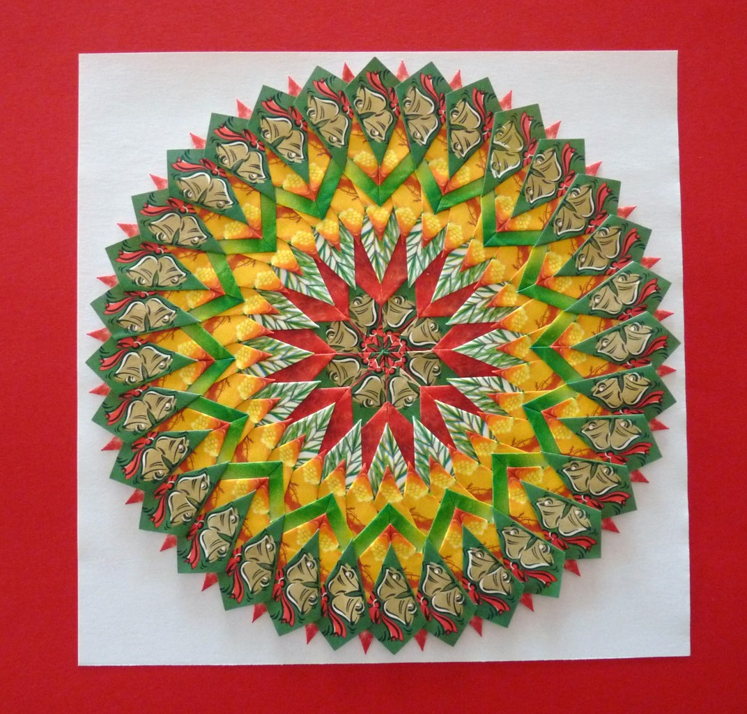 Voor deze mandala heb ik kersttheezakjes van AH gebruikt met kerstklokken en Pickwick rooibos Honey voor de mooie geel/rode kleur. Het is mooi warm van kleur.