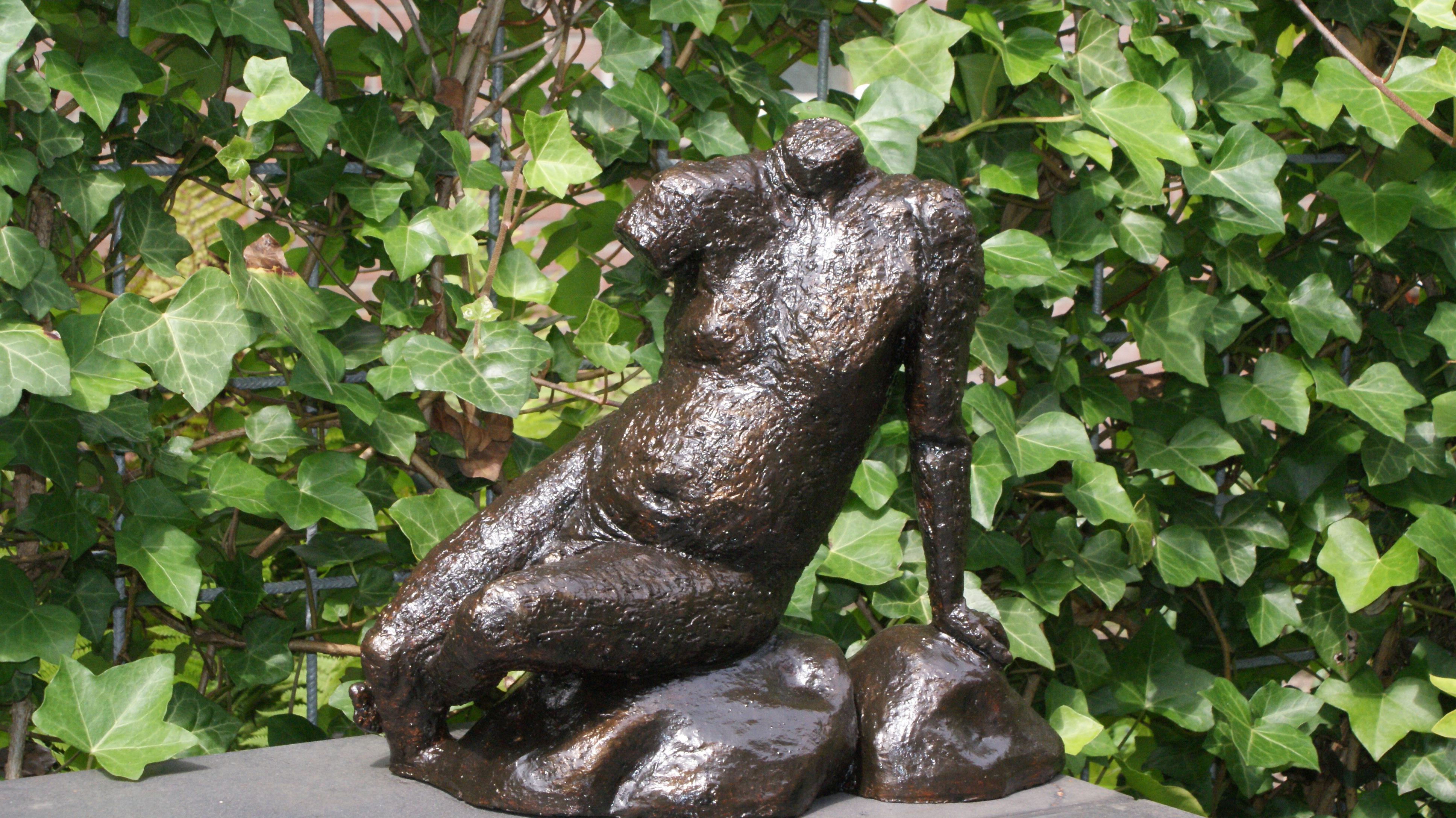 Naar naaktmodel gebeeldhouwd, met grove charmotteklei daarna gebakken en met een speciale verftechniek in "brons" geschilderd. beeld kan buiten staan