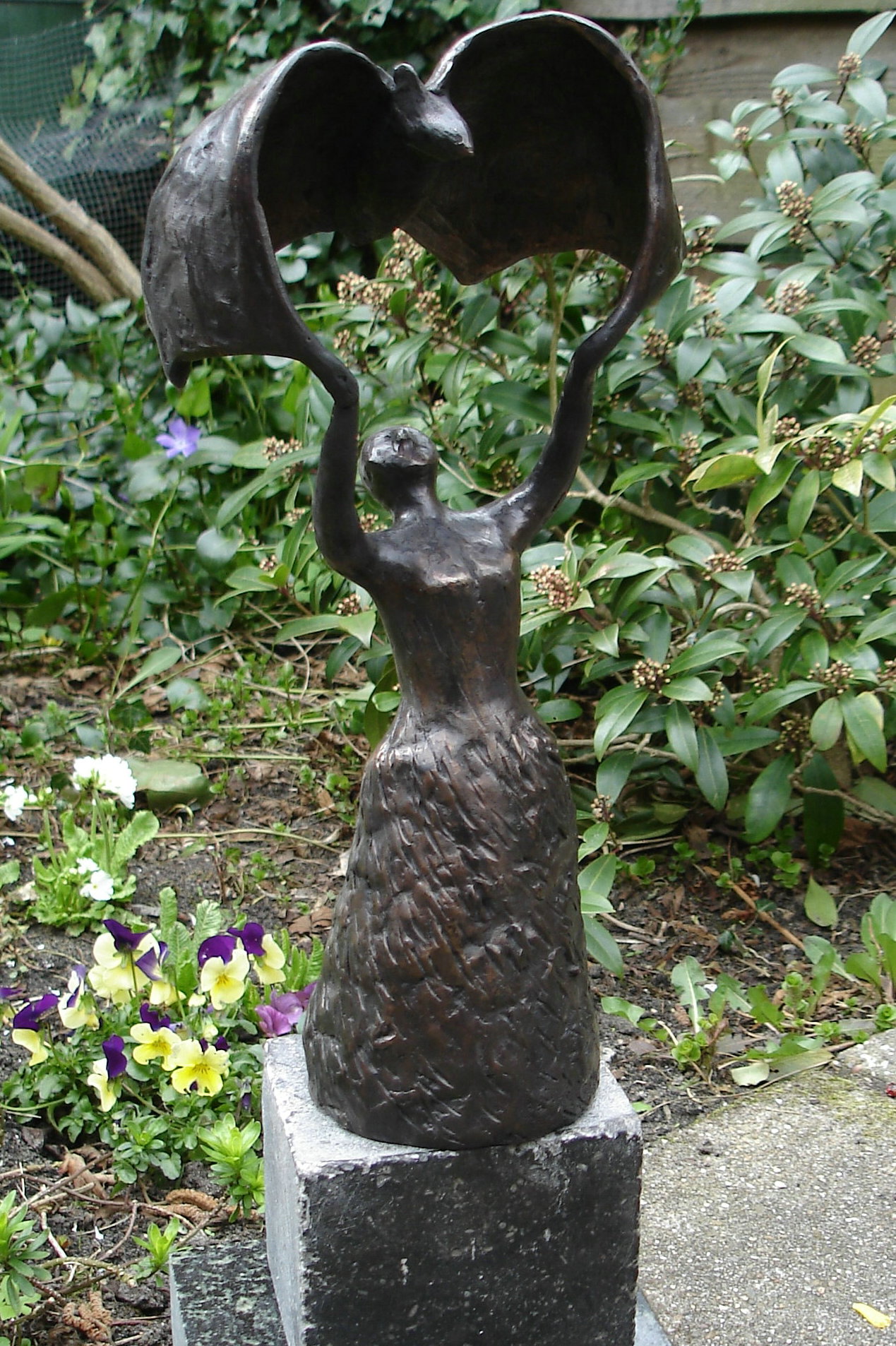 Bronzen beeld, vrouw vliegt weg als vleermuis haar vrijheid tegemoet