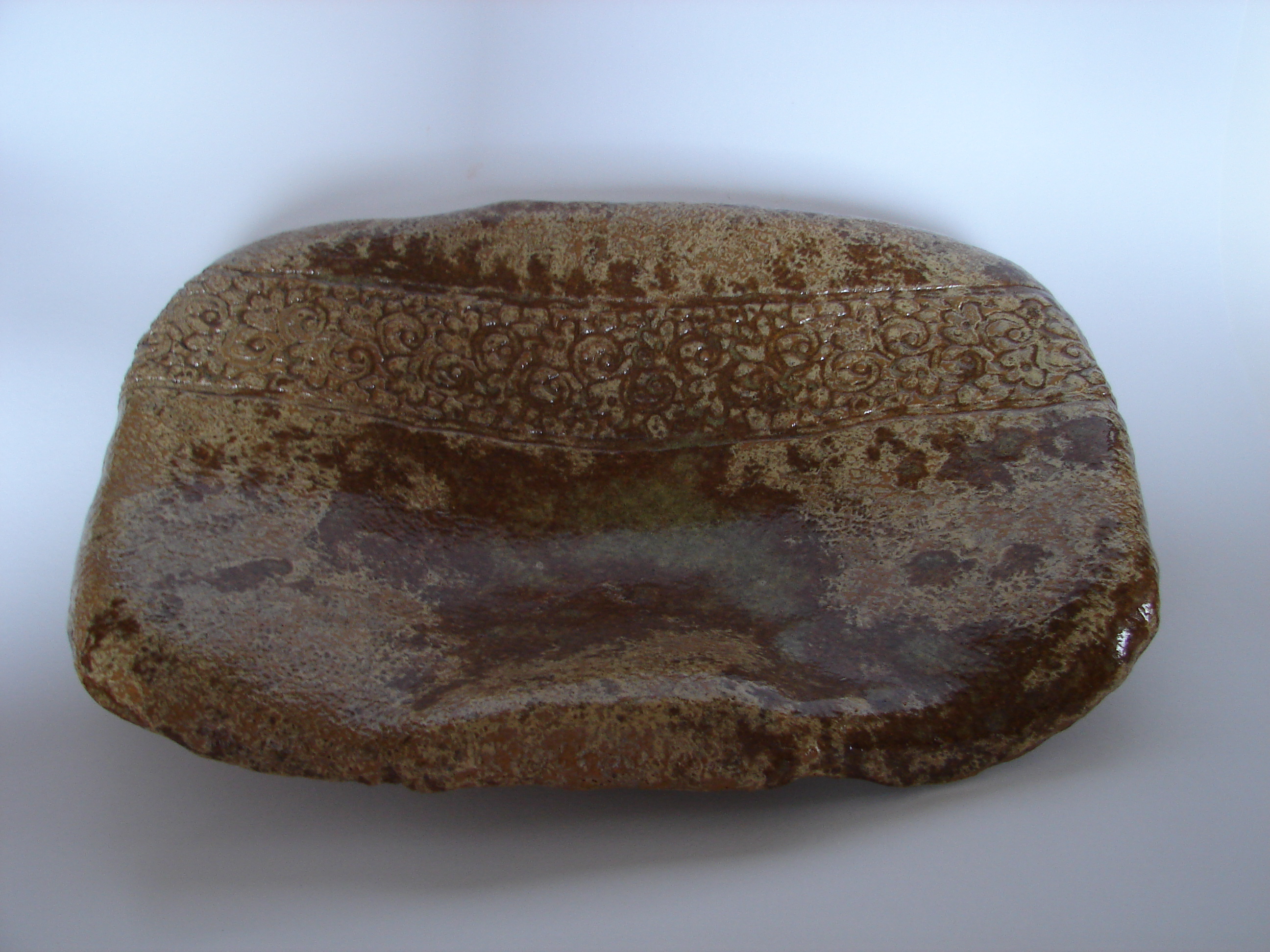 Terracotta fruitschaal op voet met ingerolde decoraties. Gesigneerd.